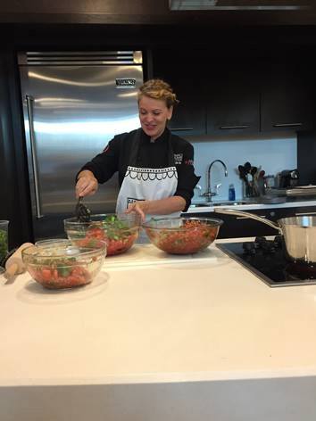 Bernstein presented a menu that she called, "total Americana – what you would eat on the 4th of July." The first dish was a beautifully paired watermelon and tuna ceviche. As she worked the dish, she offered important tips such as: ginger is the secret to a good ceviche, mix your ceviche immediately before serving, and cut your watermelon and tuna the same size in order to "almost fool people." The final product, mixed with Serrano chilis, soy sauce, basil and red onion was fresh, sweet, and visually stunning.