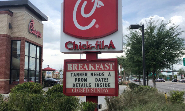 It's often said that you shouldn't mix business with pleasure, but one teenager in Florida doesn't play by the rules. Tanner Waters, a senior at Winter Springs High School, is advertising for a prom date outside the Chick-fil-A where he works in Casselberry. The restaurant's roadside signage reads: "Tanner needs a prom date! Details inside."