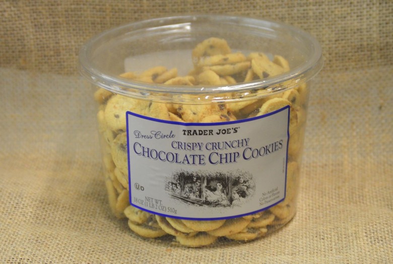 Our tasters generally found the tiny cookies inside the big plastic tub from Trader Joe's pretty enjoyable. They were light and crispy, and the fact that they were bite-size made it easy to eat too many of them. They didn't have much of a "pop," however, and were lacking in chocolate chip flavor. They also contain coconut, which a couple tasters picked up on.