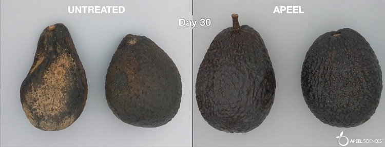 Prior to hitting store shelves, each avocado — sold by the Del Rey Avocado Company and treated by Apeel Sciences — is sprayed with a special solution made from fats found in the skins and peels of fruits and vegetables, such as apples and raspberries. This natural substance helps trap moisture inside the fruit and keep it from oxidizing until you cut into it.