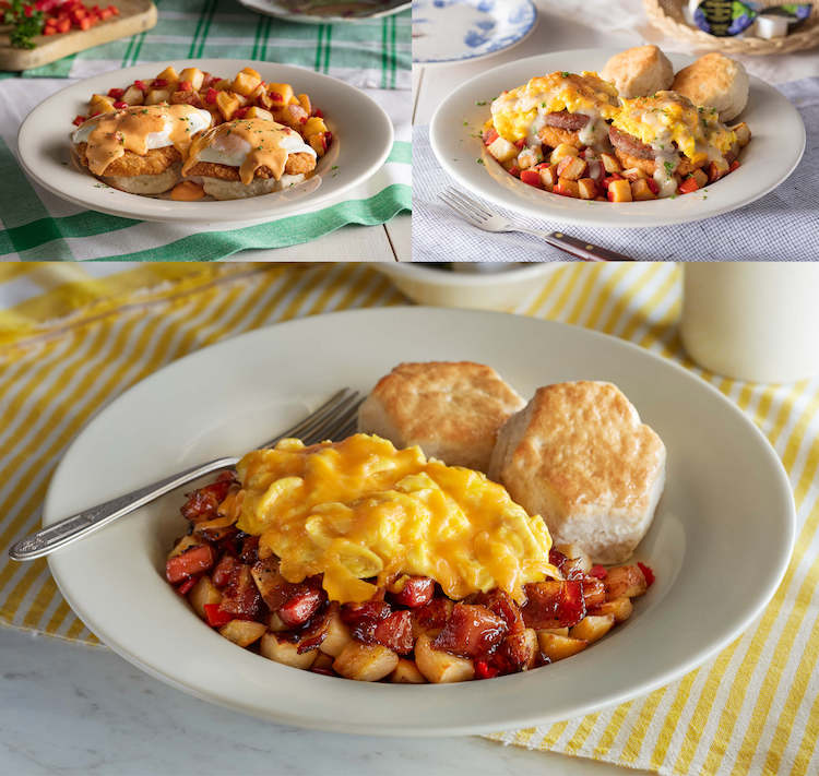 Their Ham n' Maple Bacon Bowl also sounds incredibly tasty, loaded up with maple-pepper bacon, hickory-smoked country ham, sugar-cured ham, sticky-sweet maple onion jam, and hash, plus two scrambled eggs, Colby cheese, and two buttermilk biscuits.