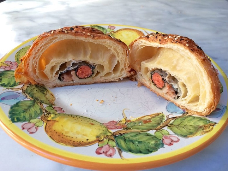 2017 has given us a fair share of food trends — some wild, some wonderful, and some completely senseless. A prominent bullet on The Daily Meal's "Dumbest" list is sushi that isn't sushi. This involves burritos, tacos, burgers, cakes, and now croissants. Mr. Holmes Bakehouse, which has locations in Los Angeles, San Francisco, and Seoul, has created the "California Croissant" — a croissant topped with sesame seeds and filled with smoked salmon, wasabi, pickled ginger, and nori seaweed. Kikkoman soy sauce is served on the side.