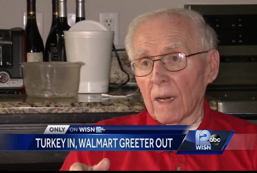 A wacky situation at a Wisconsin Walmart turned into bad news for one elderly door greeter. After a wild turkey was caught running amok at the Walmart in Waukesha last week, beloved Walmart greeter Bob Tallinger, 88, learned that he was fired for not properly alerting his manager of the incident. "He was hired to be a greeter and that's what he did," Tallinger's wife Janet told local news station WREG. "He never saw a book of rules that said if a wild turkey comes in here, you better run and get management." Thankfully, this story has a happy ending: The nearby St. Vincent De Paul Walmart location snatched Tallinger up, and he is greeting shoppers with his friendly face once again.