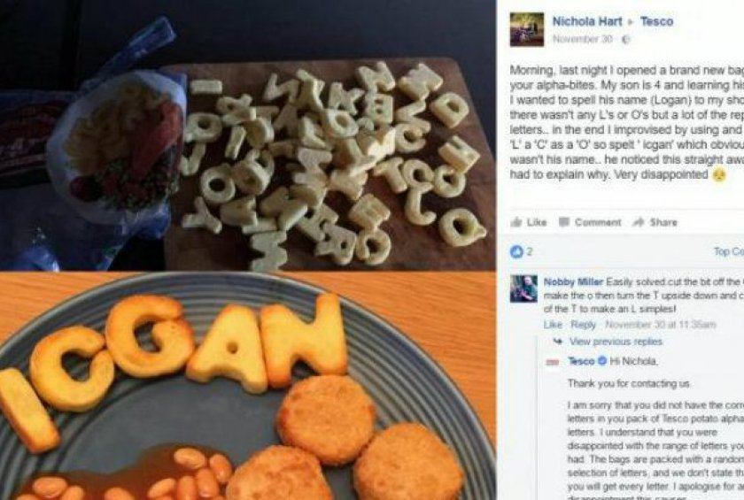 According to The Evening Times, mother Nichola Hart wrote to Tesco supermarket on Facebook to complain after buying a bag of Crispy Potato Letters but not receiving all the letters she wanted. She'd originally bought the product intending to help her 4-year old son, Logan, practice spelling his name. When she emptied the bag though, she found that she did not have an L or an O to work with. She wound up using an I instead of an L, and a C instead of an O, but her four-year-old was not impressed because his name was not "Icgan." "It is misleading, why would you sell them as alpha-bites, really they should just be called 'certain letter bites,'" she said. Tesco responded to the complaint on Facebook and said that they were sorry Hart was disappointed, but that the letters were randomly bagged and not every letter could be guaranteed to appear in every bag.