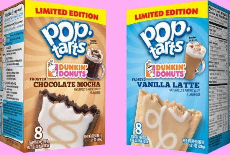 Kellogg's has given the world a gift it sorely needed: coffee-flavored Pop-Tarts. According to Mashable, the new toaster pastries are the result of a collaboration between Dunkin' Donuts and Kellogg's Pop-Tarts, and the new Frosted Chocolate Mocha and Frosted Vanilla Latte Pop-Tarts are designed to taste like Dunkin' Donuts coffee. Unfortunately, they don't actually contain any caffeine, but they will be full of sugar, so they'll at least deliver an energy rush of some sort. The Dunkin Donuts Pop-Tarts will be available for a limited time in grocery stores across the U.S. starting this month, and will sell for $2.59 a box.