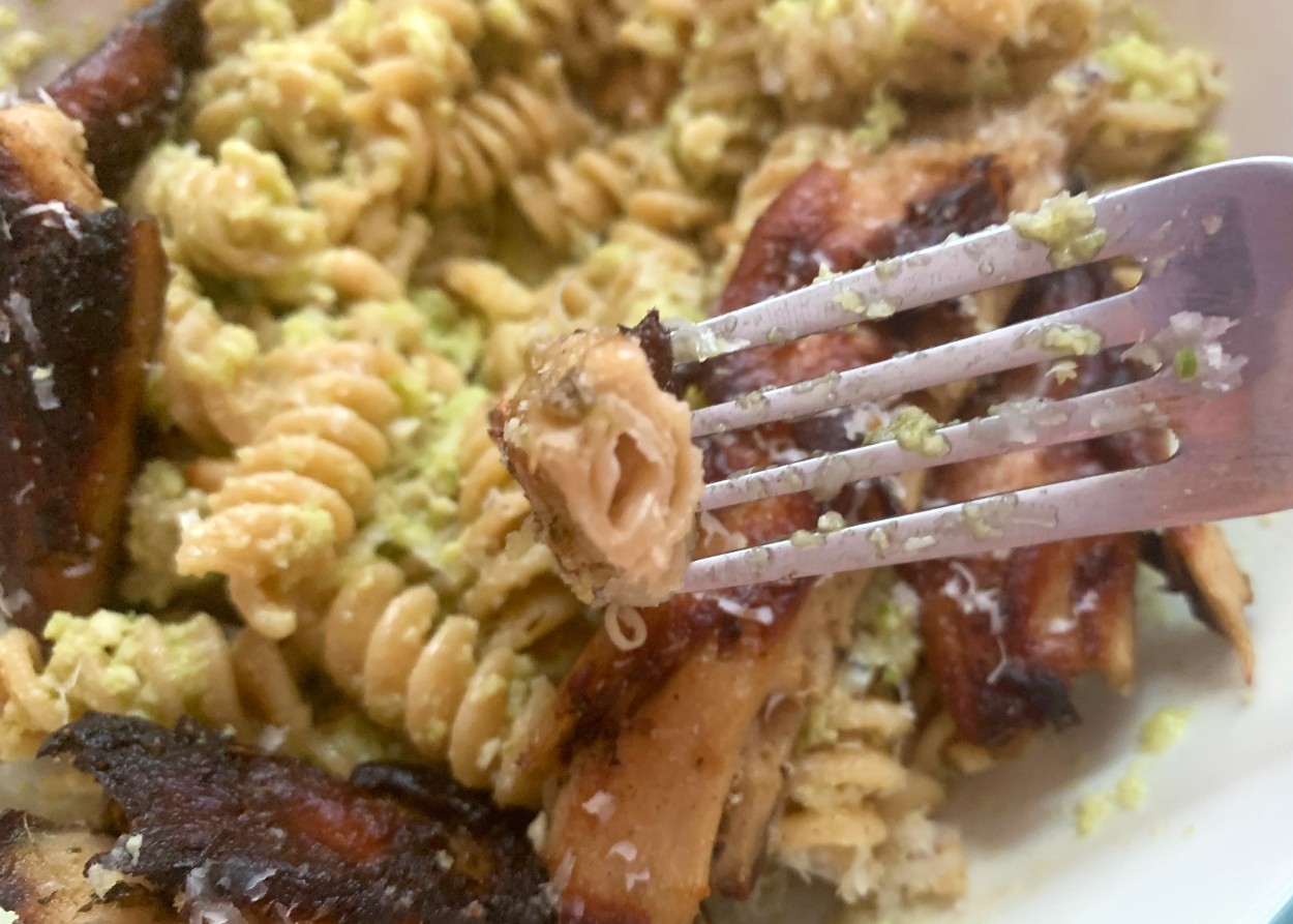 The first flavor I tried was the Lemon & Herbs pack. I'd made my latest obsession, garlic scape pesto, the evening before and had leftovers and figured, hey, even if the chicken isn't my thing, pesto, cheese and pine nuts will make anything delicious!