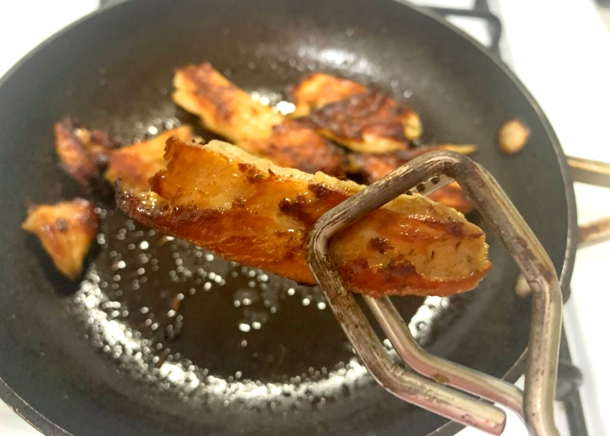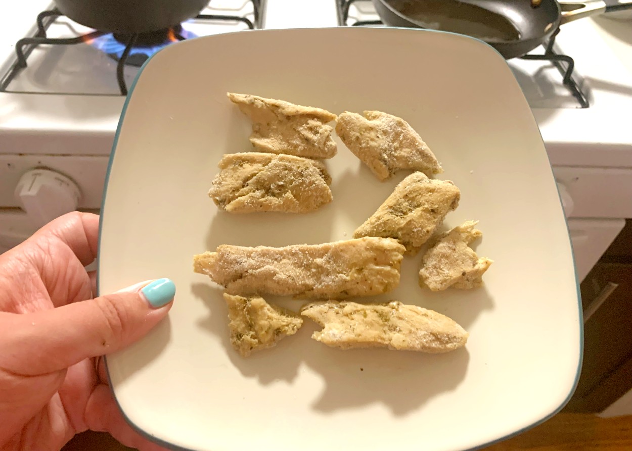 That worry came true. When it came to cooking the pieces, I followed the instructions on the back of the bag: added a little vegetable oil to a small saute pan, turned the stove on and fried away.