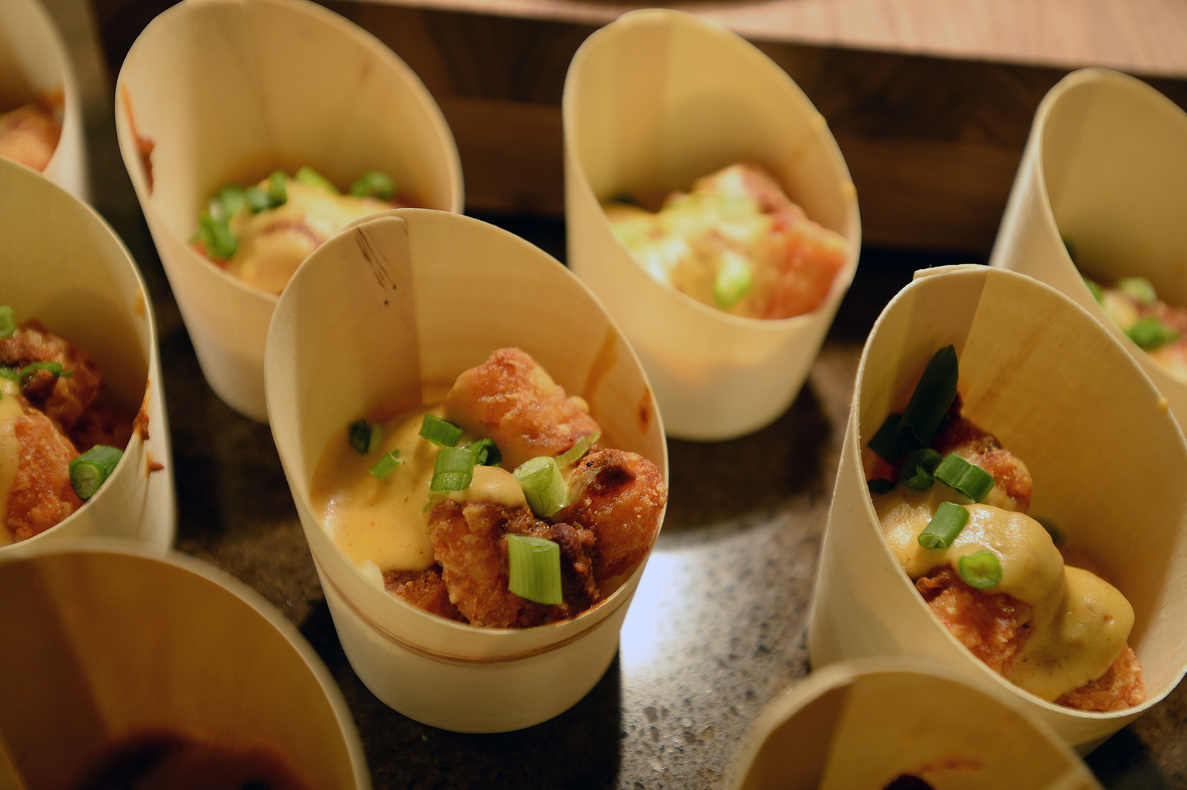 Lots of Tots: Standard fries are benched this season by cups of garlicky and chili-cheesy tater tots, as well as the new, marinated Chicken Bites, tossed in Buffalo sauce, or served naked with a side of Morehouse Honey Mustard.