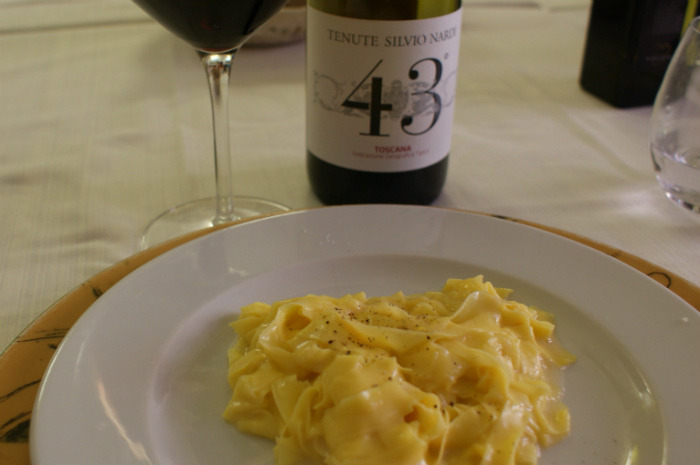 Yes, there once was an Alfredo who invented pasta named after himself – fettucini Alfredo, a rich mélange of butter, cream, Parmesan cheese and salt and pepper. We visit his shrine — restaurant Alfredo alla Scrofa — for lunch. The sauce is whipped up tableside to be enjoyed with a bottle of Silvio Nardi "43" Tuscan IGT red.