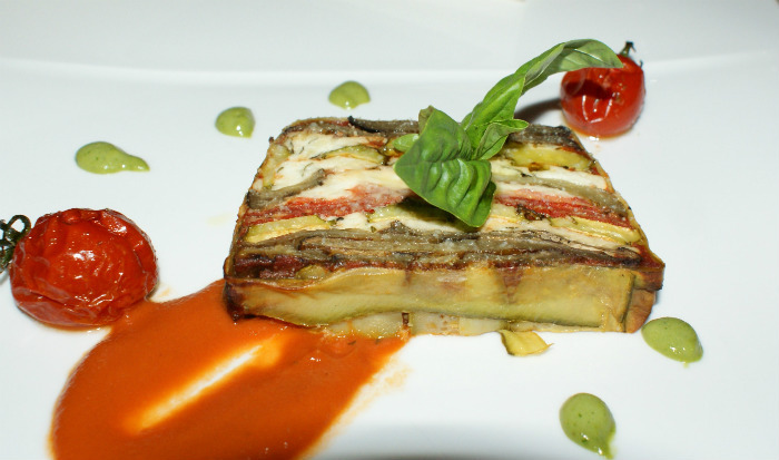 We give a farewell toast to Rome at the posh Ristorante Mirabelle with its rooftop view of Rome and St. Peter's in the distance. We dine on guinea fowl and cannelloni with summer truffles. But we can't leave Italy without paying homage to the humble aubergine, here elegantly served in a terrine. Grazie, Emilia, grazie!