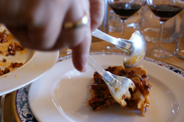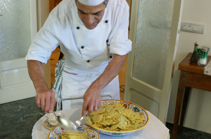 Following an array of appetizers in Emilia's parlor, we are called to the table where a private chef parcels out rich ravioli stuffed with ricotta and parsley. We savor it with a trebbiano di Abruzzo with a lot of savory notes to match the spice and cheese of the pasta.
