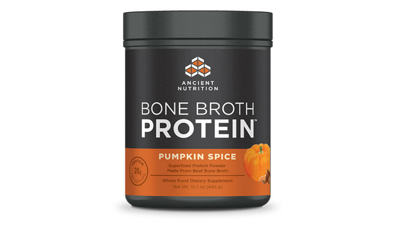 If you're looking for something savory with a low calorie count, you can turn to Ancient Nutrition's Bone Broth Protein in the pumpkin spice flavor. It's made of beef bone broth and features all the familiar fall flavors. This paleo-friendly product has 20 grams of protein, no carbohydrates and 16 grams of collagen. It's gluten-, grain-, dairy-, soy- and nut-free.