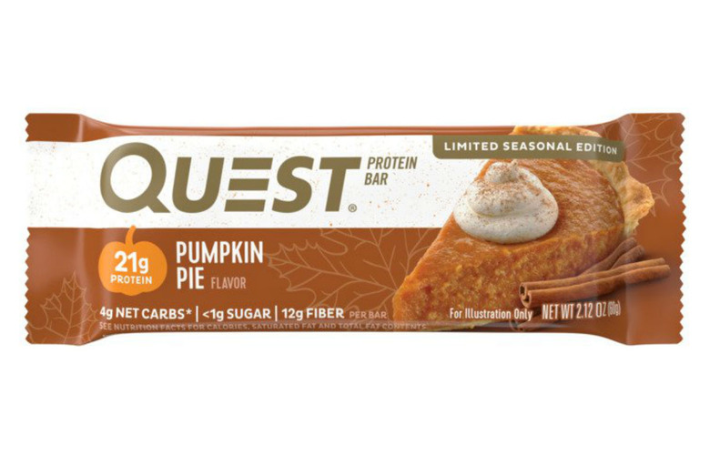 Quest Nutrition's pumpkin pie protein bar features fall spices and vanilla-flavored cookie pieces, and contains 21 grams of protein, four grams of net carbs, less than one gram of sugar and 12 grams of fiber. RXBAR also makes a pumpkin spice-flavored protein bar made from dates, egg whites, cashews, almonds, cinnamon, "natural flavors," pumpkin and cloves. It has 12 grams of protein, 14 grams of sugar, 24 grams of carbs and five grams of fiber.