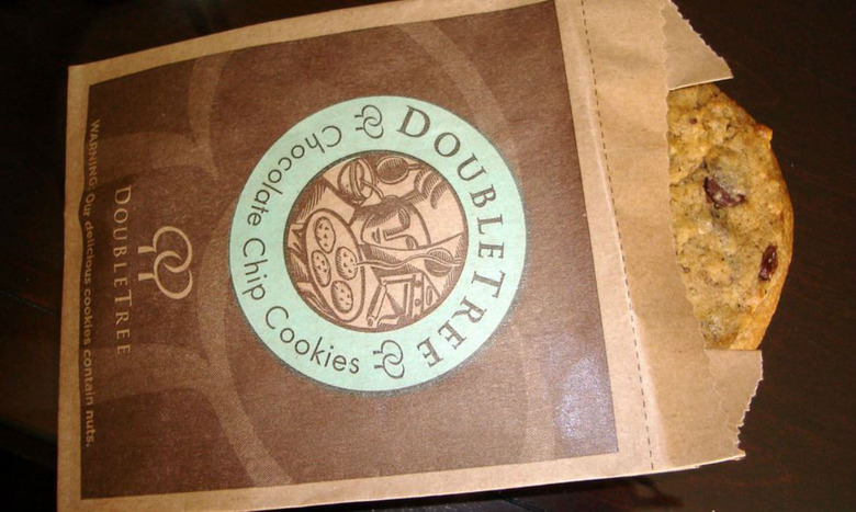 Since 1995, everyone who checks into a DoubleTree Hotel has been gifted with a fresh chocolate chip cookie. Formulated by the Christie Cookie Company exclusively for DoubleTree parent company Hilton, the hotel chain gives away about 77,000 cookies daily, or more than 28 million annually. The two-ounce cookies are baked fresh at each hotel. Every cookie contains 20 chocolate chips on average, and if you're like most people it's disappeared before you've even gotten to your room. But we were recently sent a batch of individually-wrapped cookies complete with nutrition information, and you might want to reconsider before you absent-mindedly eat your next one.