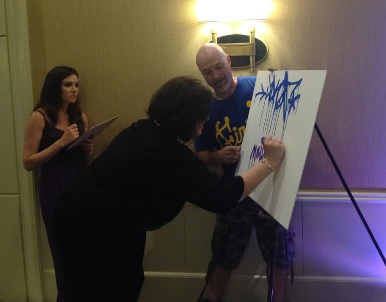 After the crash course — during which we learned about early graffiti artists like Cornbread and Stay High; the golden age of graffiti in the '80s, when artists like DONDI used whole subway cars as their canvas; and the state of contemporary street art, with artists like Shepard Fairey and Banksy becoming international brands — guests were encouraged to come up with their own personal "tags" and write them on a canvas with a graffiti marker. Guests then followed Ethan to an outdoor space where four canvases were set up; after a quick lesson in the proper application of spray paint (how to choose the right spray cap, how to achieve the desired thickness, the differences between professional graffiti spray paint and Krylon), we donned ponchos and gloves to try our hands at creating graffiti ourselves. Ethan and his team saved the two middle canvases for themselves, and used the opportunity to create two custom pieces to commemorate the event over the course of the evening.