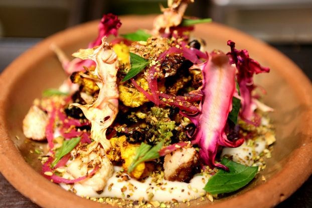 One of his most popular dishes is blackened cauliflower. He starts with a base of cauliflower puree then layers the dish with roasted cauliflower (including colorful stems), lemon and red onions soaked in lime juice, sea salt, and topped off with pistachios.