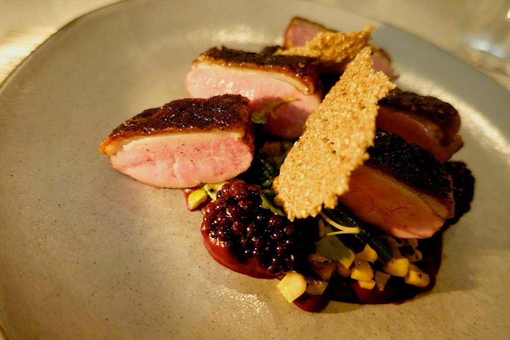 In opposition to the bright tones of the opening dishes, Hawksworth's Yarrow Meadows duck from Fraser Valley carries a richer, heavier timbre, with the most satisfying result. Marinated overnight in orange and aromatic spices, the impeccably cooked duck sits on a bed of charred corn, with blackberry puree. The duck skin is perfectly crispy, a bite shattering into a unctuous and flavorful layer of fat. Understated sweetness from the blackberry puree thoughtfully cuts through the weighty gaminess of the dish, and a subsequent salty sweet combination presents the duck in a rewardingly affirmative manner.