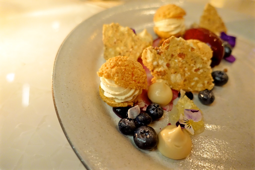 The ending sweet notes of Hawksworth's dinner are some of the most picturesque. A tart blueberry sorbet served on top of a sweet and velvety gel. Blueberries and buckwheat cookies, shattering with every crunchy bite, sit opposing next to perfect pillows of light choux pastries stuffed with toasted white chocolate. The striking texture of the dish once again prevails, with the roughness of the cookies antagonizing the melting tart sorbet, which in turn, sings in harmony with the creamy white chocolate. It's all connected beautifully by the most fragrant of locally foraged honeycomb from the neighboring mountains, an element of the dish that you'll no doubt wish you had more of in every bite.