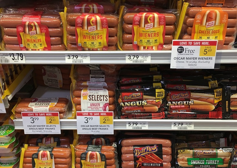 If you eat hot dogs once a year every Fourth of July, you're a rarity among Americans. According to a survey by the National Hot Dog and Sausage Council, the average American consumes about 70 hot dogs a year. So if you're only eating a couple every Independence Day, you're probably rather health conscious. Hot dogs are considered pretty unhealthy due to their high levels of fat and sodium. Typically consumed with high-carb buns, hot dogs, Polish sausages, and other wieners of their ilk are far from a balanced meal. But that doesn't mean you can't bring home hot dogs that'll make the whole family happy without breaking your diet.