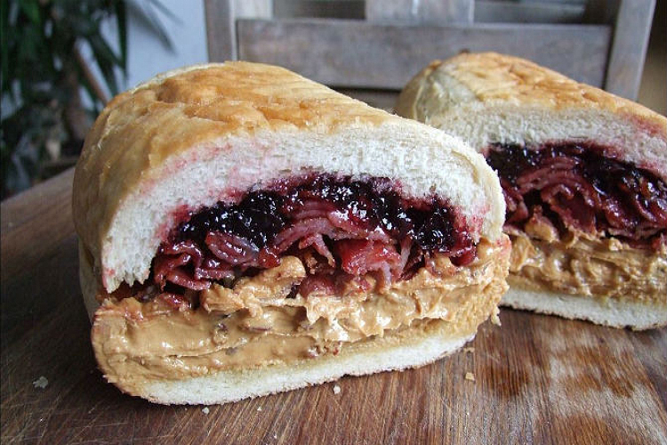Elvis' favorite sandwich was famously made with a combination of peanut butter and sliced bananas on bread fried in a frying pan. Bacon makes an appearance in some accounts, and the sandwich can be fried in either butter or bacon fat. One report claims that a true Elvis sandwich was made with caramelized bananas and eaten on grilled Hawaiian bread.