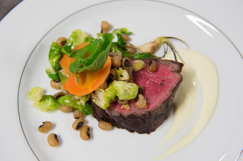 Snake River Farms New York Strip with Fried Black Eyed Peas, Boiled Dressing, Brussels Sprouts, Carrots, and Turnips
