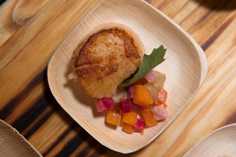 Diver Scallops with Sunchokes, Persimmons, and Watermelon Radishes