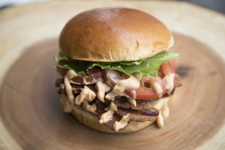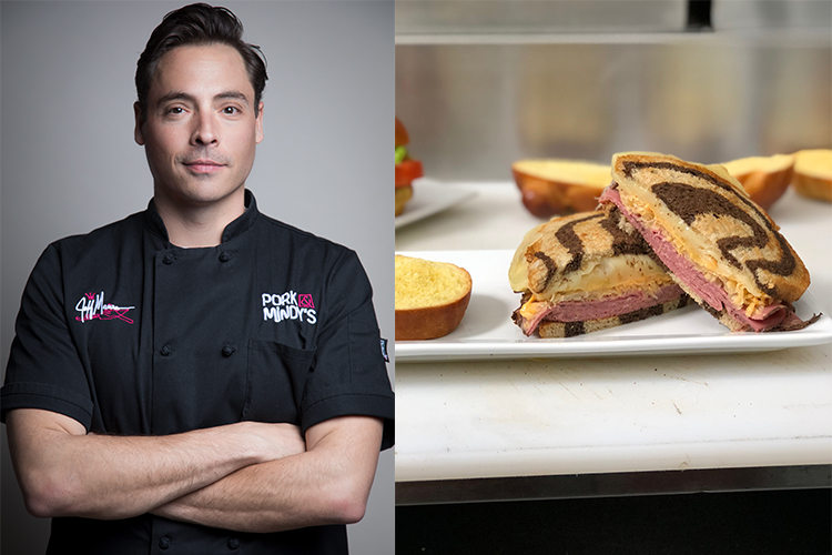 Before digging into his creations, The Daily Meal staff got a rundown from Mauro, who has shared his sandwich tips with us before. Talking about his Pig Candy BLT, Mauro described it as a "slow carmelized and smoked brittle pig candy... It's beautiful. On that, we have a barbecue mayo, fresh roman tomatoes that we season, romaine lettuce, and to add a little more fun, a little more depth of flavor, we have caramelized onions." The pastrami reuben, he said, "is a nice, smoky pastrami instead of your traditional corned beef" with a "nice, cakey 'kraut." Made on buttered marble rye and then grilled all together, the sandwich also contains aged Swiss cheese and Mauro's "18,000 Island" dressing (which, he claims, is "17,000 times better" than Thousand Island dressing).