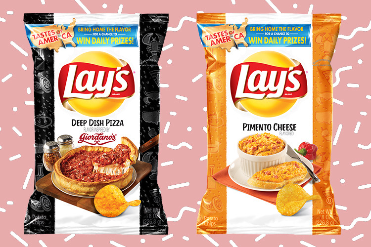 The eight regionally-available flavors are: Cajun spice (Central Gulf), chile con queso (Texas, Oklahoma, Mountain states, Southern California), Chesapeake Bay crab spice (Mid-Atlantic), Giordano's deep-dish pizza (Heartland and Mid-America), fried pickles with ranch (Midwest): New England lobster roll (Northeast), pimento cheese (Southeast), and Thai sweet chili (Pacific Northwest).
