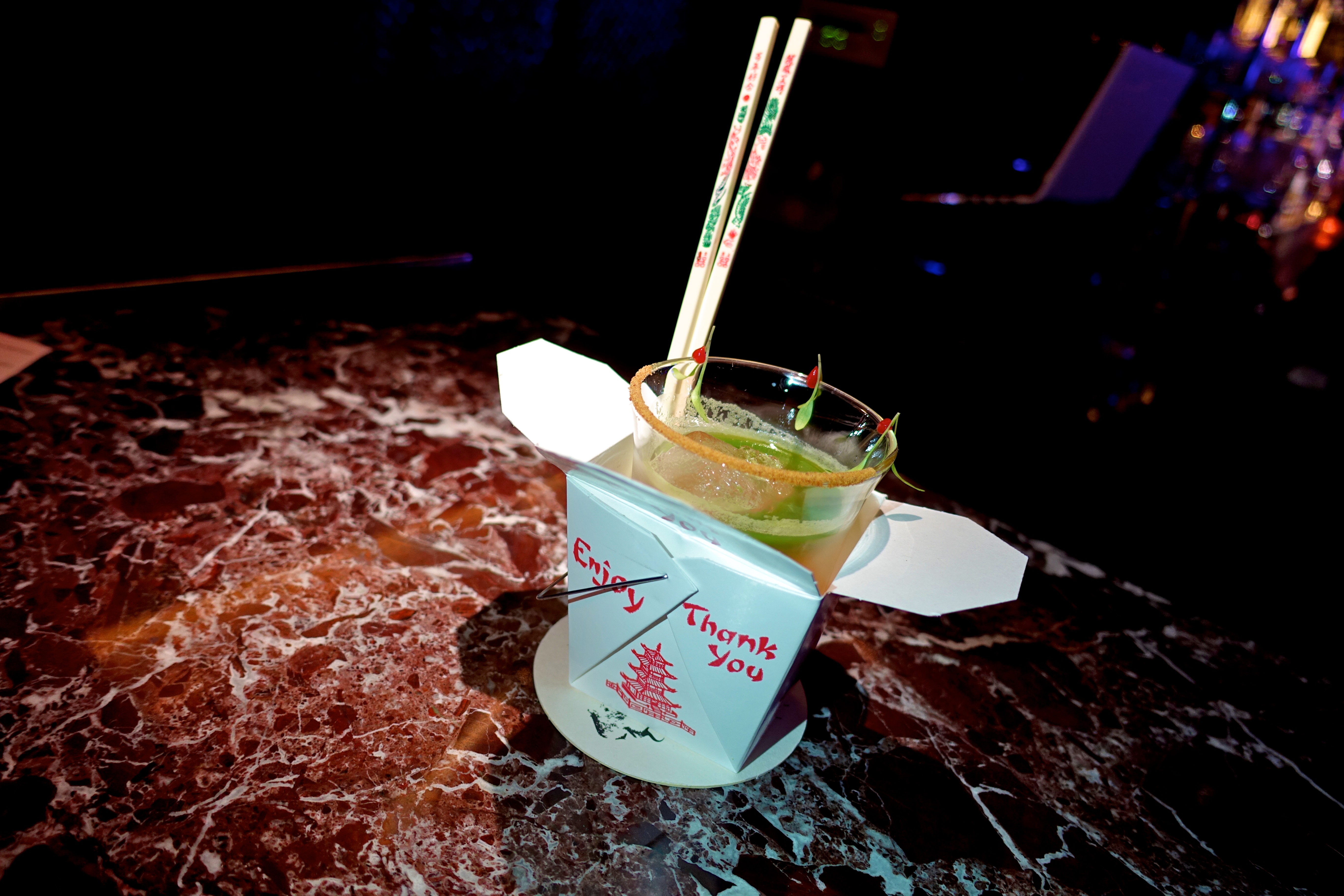 Walking down the stairs of StreetXO, I enter a dimly lit basement, accented by loud neon signs, a bustling open kitchen, and a large marble cocktail bar. Starting my evening at the bar, the cocktail list served as an overture for what was to come later. I order the "Drinking Pekin' Duck", and am presented with a Chinese takeout box, with accompanying chopsticks. Opening the box, I face a layer of two liquids – one dirty orange colored liquid of mezcal dressed with Shaoxing wine, and one bright green layer of lime and cucumber soda floating above that. Along the rim of the glass sit three delicately placed droplets of raspberry hoisin syrup, with the smallest piece of baby cilantro wedged on top. On the opposite side of the rim, a smothering of dehydrated duck – the rough, brown powder, an ingredient this traveler has never seen before in his life, inside or outside of a bar. I soon learn that the majority of the food and drink at StreetXO is to be experienced through a instructed process. "You use the chopsticks to stir and mix the drink, and then you lick the duck powder, and then the hoisin. Then you make sure you have those flavors in your mouth when you drink the cocktail." It's a nerve-rackingly complex process for a drink, but the end result is humorously successful. It's a conglomeration of a dry saltiness from the savory dehydrated duck powder thrown against the sweetness of the hoisin and the mezcal. The lime and cucumber bring it together with a welcomed kick, and it's a confusingly pleasant taste, with familiar tones of the popular Chinese classic dinner. Scratching my head at what I had just sipped, my dining companion's drink, a cocktail based on a Tom Kha Kai curry didn't help my state of mind. A Cachaça rum base, with galangal, coriander, kaffir lime, and chili mixed in before being topped with tobiko (flying fish roe) and coconut powder. It's one of the strangest drinks I've ever consumed, with the gentle sweet fruitiness of the Cachaça interrupted by the sharp spice of the galangal and chili. The tobiko almost plays the role of popping boba balls in an Asian pearl milk tea. It's, again, something which on paper shouldn't work. But it somehow does.