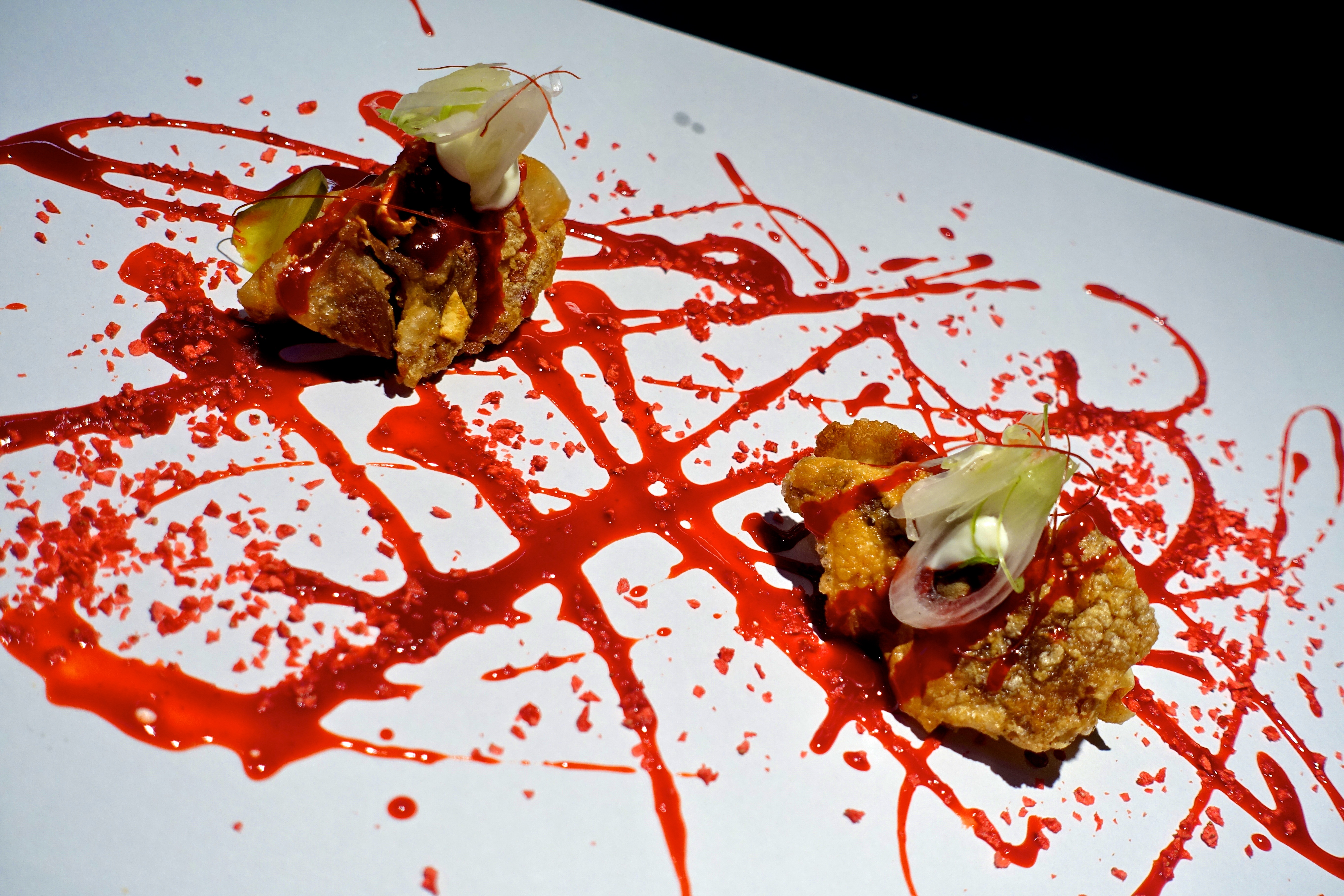 The menu at StreetXO features a series of small plates intended to be shared, and it follows the restaurant's intention of being a social experience rather than a traditional dinner. Our first dish arrives, and sets the unmistakable tone of the evening. Before us sits a dish that looks like a Jackson Pollock depiction of murder scene from Dexter. Aggressive lashings of bright red strawberry hoisin is sprawled across a sheet of white paper, where Pekinese dumplings sit served with crunchy pig's ear and pickles. We're instructed to grab the dumplings by hand, and smear them around the hoisin sauce. The curious pairing of textures is wonderfully successful, full of intense flavor in a moreish, gluttonous bite. The chewy gluiness of the dumpling, heavy and staunch, is offset by the crunchy bite of the pig's ear, and the sweet tang of the hoisin unifies all elements perfectly. The careful use of ito togarishi (angel hair chili), one of my favorite garnishes, adds the extra level of spice with its warm, fruity after kick. It's a dish that tastes as good as it photographs.