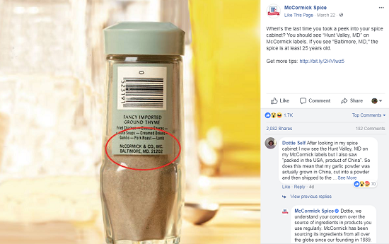 "When's the last time you took a peek into your spice cabinet? You should see 'Hunt Valley, MD' on McCormick labels. If you see 'Baltimore, MD,' the spice is at least 25 years old," the seasoning brand wrote on its Facebook page.