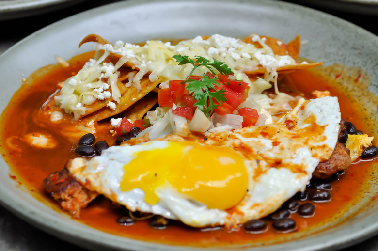 Chilaquiles features fried corn tortilla chips simmered with salsa or mole. It's usually garnished with cheese and other toppings, like sliced onion, shredded chicken or fried eggs. You might see this one on the menu at your favorite brunch restaurant.
