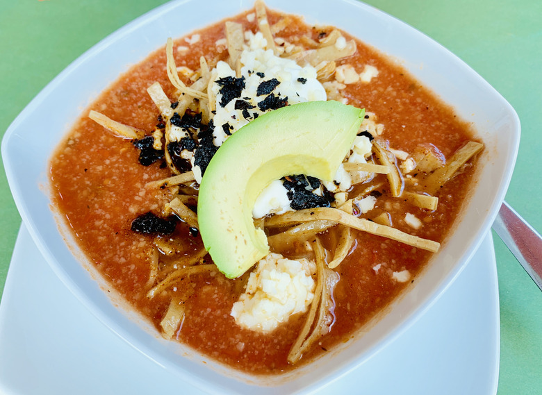 Sopa Azteca is tortilla soup. The pasilla chili and tomato base is ladled into a bowl and topped with tortilla chips, jack cheese, Mexican crema and avocado.