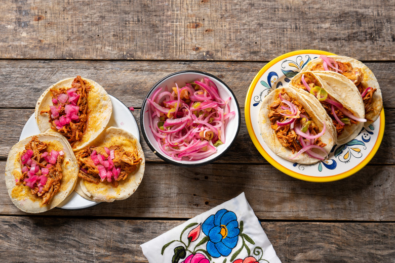 Cochinita pibil is slow-cooked pork marinated with achiote paste, garlic, spices and orange juice, wrapped in banana leaves. The tender meat is best served in tacos with pickled onion.