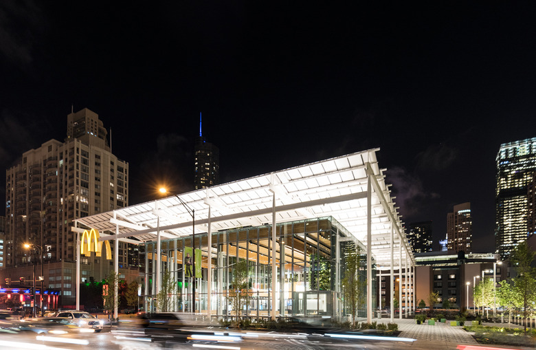 Chicago's River North neighborhood used to boast a two-story "Rock 'n' Roll" McDonald's, but that has given way to a futuristic, single-story, 19,000-square-foot, eco-friendly McDonald's at 600 North Clark Street. The new glass, timber, and steel structure opened this year and has apple trees atop the kitchen, a solar panel array to collect energy, and a "floating glass garden" of ferns that hovers over where customers place their orders.