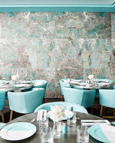According to a press release from the brand, "The iconic Tiffany Blue is infused throughout the interior floor plan and most notably at the forefront of the café's design." From what we can tell via photos, the dining experience will be not unlike sitting in a luxurious Tiffany box.
