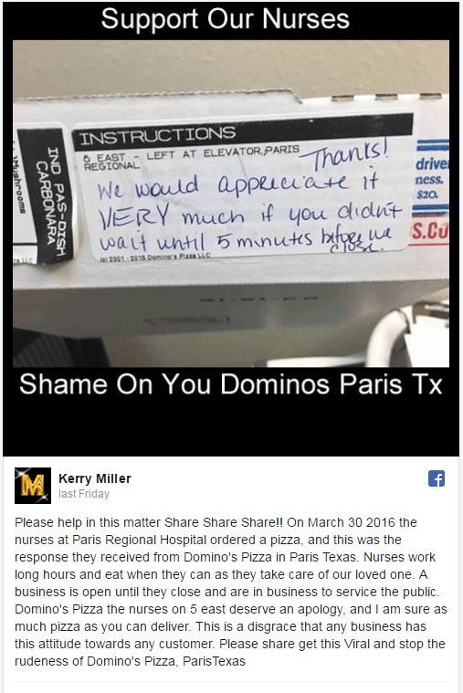 "Nurses work long hours and eat when they can as they take care of our loved one. A business is open until they close and are in business to service the public," Miller posted. "Domino's Pizza the nurses on 5 east deserve an apology, and I am sure as much pizza as you can deliver."