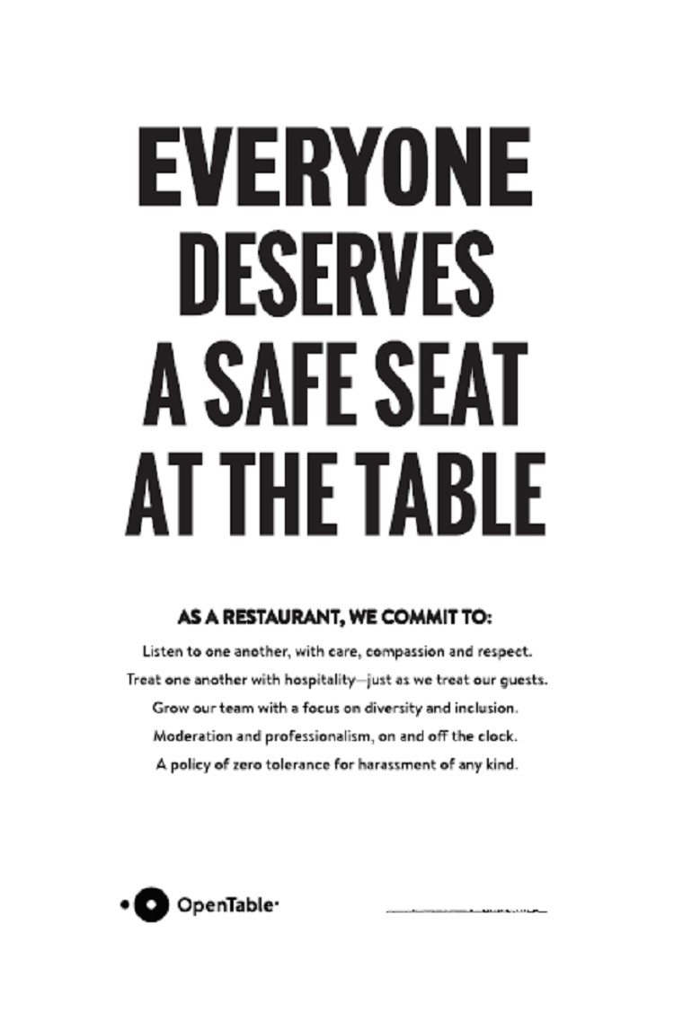 The California-based company is encouraging restaurateurs to enroll in a free webinar, led by Mammoth HR, that will detail best practices and measures to avoid harassment. OpenTable has also released a "pledge poster" for owners and management to hang up in their establishments. The flyer asserts that "everyone deserves a safe seat at the table," and continues on to list restaurant commitments: Uphold a zero-tolerance policy for harassment of any kind; treat one another with the same hospitality as they treat their guests; listen to one another with care, compassion, and respect; grow the team with a focus on diversity and inclusion; and cultivate a professional environment always.