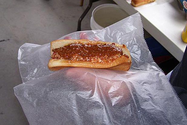At least 50,000 chili dogs are sold the day of NASCAR races. Dale Earnhardt reportedly liked to eat them before qualifying (he said they gave him "extra octane"). The recipe is secret, but includes slaw, chili, and onions. How did the connection start? Innocently enough, according to the track's website. Decades ago, a hot dog with slaw, chili, fresh onions and a few other secret ingredients were wrapped in waxed paper and sold in Martinsville Speedway's concession stands. They've been a staple ever since.
