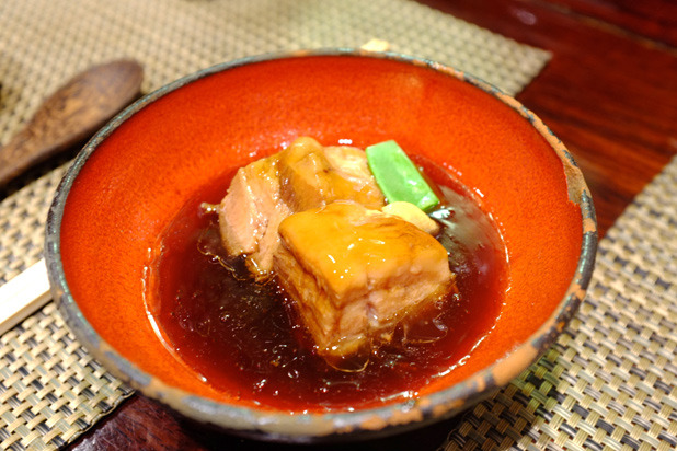 At this subterranean restaurant, called a "Japanese hideaway" by Pete Wells, the pork belly is slowly simmered until it's soft and tender, then served with snow peas, a light and faintly sweet glaze, and mustard.