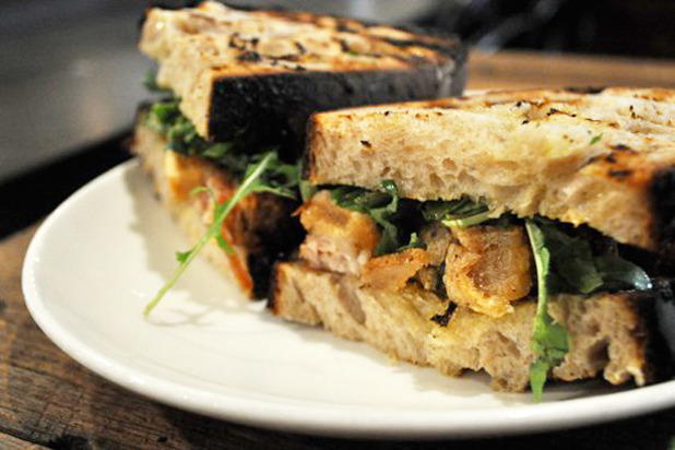 To make this sandwich, a Sardinian spin on the traditional porchetta, whole suckling pigs are slowly roasted before being thinly sliced. The meat (heavy on the skin and belly) is then piled onto thick-sliced brown bread and simply dressed with some greens. Minimalist and delicious.