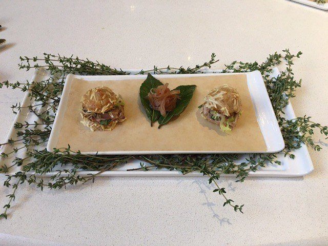 Eric Damidot: Every year NOWFE happens at the convention center, and we participate in [all five categories of] the Fleur de Lis culinary competition. Now the Fleur de Lis judges will be coming here in three weeks to judge the competition; however, we will not know the results until NOWFE night where we see who is awarded the gold medal, the silver, and bronze. Last year out of the five categories, we had three gold medals and two silvers, so I want to see how many gold medals we will have this year. The first dish, from the seafood category, is a stuffed calamari; the second poultry dish consists of different poultry plated with quail eggs into a little bird's nest; the soup will be an oxtail. For the lagniappe, we are doing a bouchée, a small puffed pastry with cheese, while making it into profiterole sandwich bouchée, which will be interesting. The dessert is a combination of citrus fruit pastry.