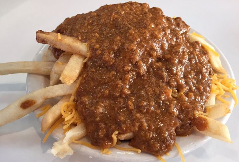 Like Cincinnati chili, Detroit-style chili is also more of a sauce, but this version is Greek-inspired, with paprika and dried oregano bringing different flavors to the recipe. It's also sometimes thickened with a roux, which gives it a more gravy-like consistency, and is usually made with ground beef heart. When it's served atop a hot dog with some mustard and onions at Detroit institutions like American Coney Island and Lafayette Coney Island, it becomes a "coney dog," one of the most iconic dishes in America.