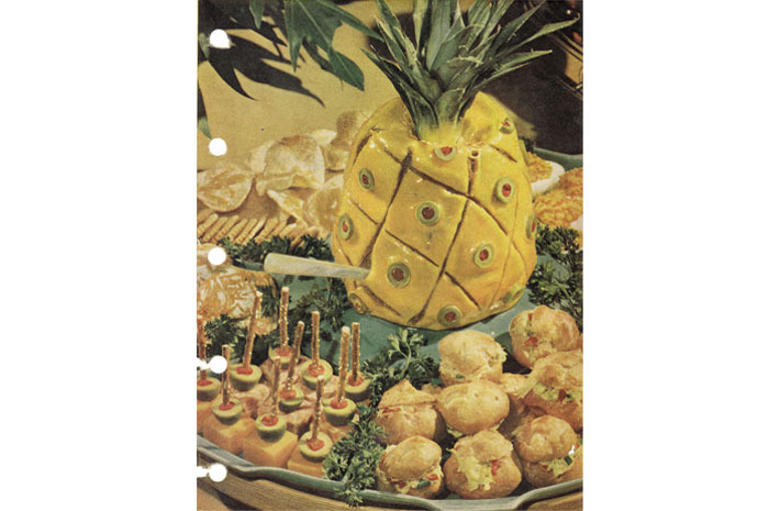 Liver sausage exists (it's usually called liverwurst), as do pineapples. Why a Better Homes and Gardens employee thought to sculpt a giant glob of liver sausage to look like a pineapple, the world will never know. Yes, to make this dish, someone mixed a whole lot of liver sausage with gelatin, formed it into a big tube, covered it with a lemony, mayonnaise-based... shell (?), then topped it with a pineapple top. To think of all the time it took to make this dish... that's time that could have been much better spent.