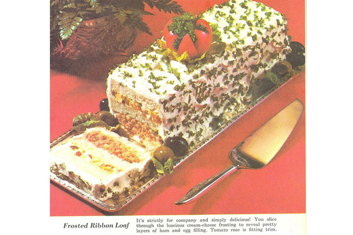 The name of this dish reveals absolutely nothing about the finished product, except for the fact that it's a loaf. So let's slice it open and see what's inside! Down through the cream cheese frosting (at least it's not mayo) and into what looks like white bread, ham, and eggs. No thanks.