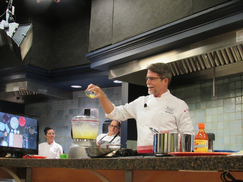The first course took a Mexican spin on a well-known favorite. The BLT tostadas started with tortillas fried up until brown and crispy. Fat from the bacon was the secret here to making them extra savory. Bayless then used the food processor to show how easy it is to make your own avocado mayonnaise. He added plenty of green chile for heat and the ubiquitous cilantro. Piled with tomatoes and bacon, the BLT tostadas were a fresh, mouth-watering starter.