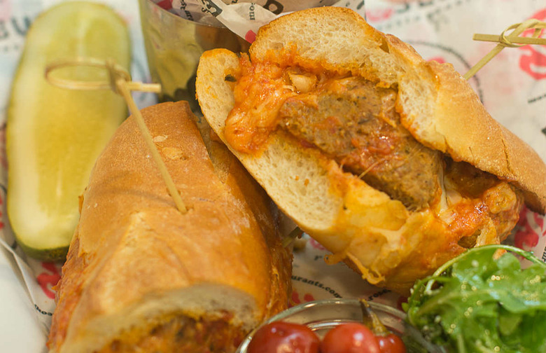 One of the traditional Italian staples at Centro Ristorante in Chicago's River North neighborhood is the Rosebud meatball sandwich. Three hand-rolled Rosebud meatballs, comprising prime beef, fresh herbs, and a blend of imported Parmesan-Reggiano and pecorino Romano cheeses, are cooked in house-made marinara sauce and topped with fresh mozzarella before being baked in a crispy baguette.