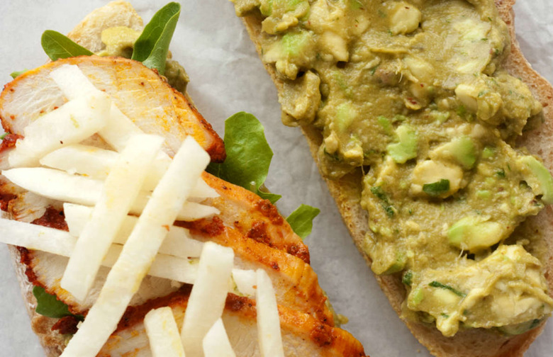 Flour Bakery + Café, chef/owner Joanne Chang's most popular sandwich creation starts with house-made focaccia bread, either white or wheat. Avocado that's been mashed with lime, red onion, chipotle, cilantro, and salt and pepper is spread on both sides of the bread. Then come mesclun greens, thinly sliced chicken that's been marinated overnight in achiote paste and slow-roasted, and jicama that's been julienned and tossed with lime juice, lime zest, and honey.