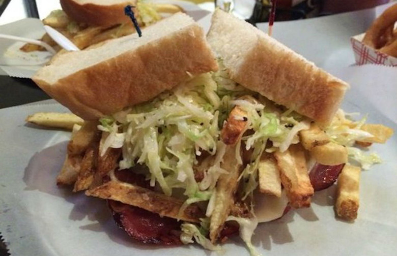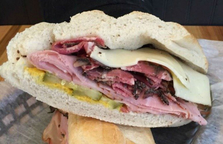 This sandwich, from Austin's Noble Sandwich Company, is a work of art. Start with the bread. It's your choice of white or wheat, made fresh in-house. It gets a light layer of whole-grain mustard and aioli, both also made in-house. Some bacon, cured in-house for five days (sense a trend?), is then added, then topped with a little pulled pork that's slow-roasted overnight. Then the real star of the show is added: house-cured ham, rubbed in ancho chile, dried chile flakes, sugar, salt, and pepper and brined for six days before being baked and sliced paper thin. Finally, the top slice of bread. This sandwich is a beauty, one of the country's finest homages to, well, the noble pig.