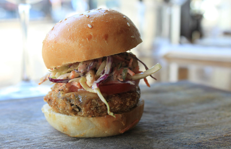 In San Francisco, Parisian chef Nicolas Ronan of Bisou Bistronomy has begun serving an escargot burger. Served on a mini sesame bun, the univalve patty is garnished with parsley aïoli coleslaw, tomato, caramelized shallots, and smoked xeres sauce, the combination of which encapsulates all the signature flavors found in a classic escargot dish into a bite-sized burger.